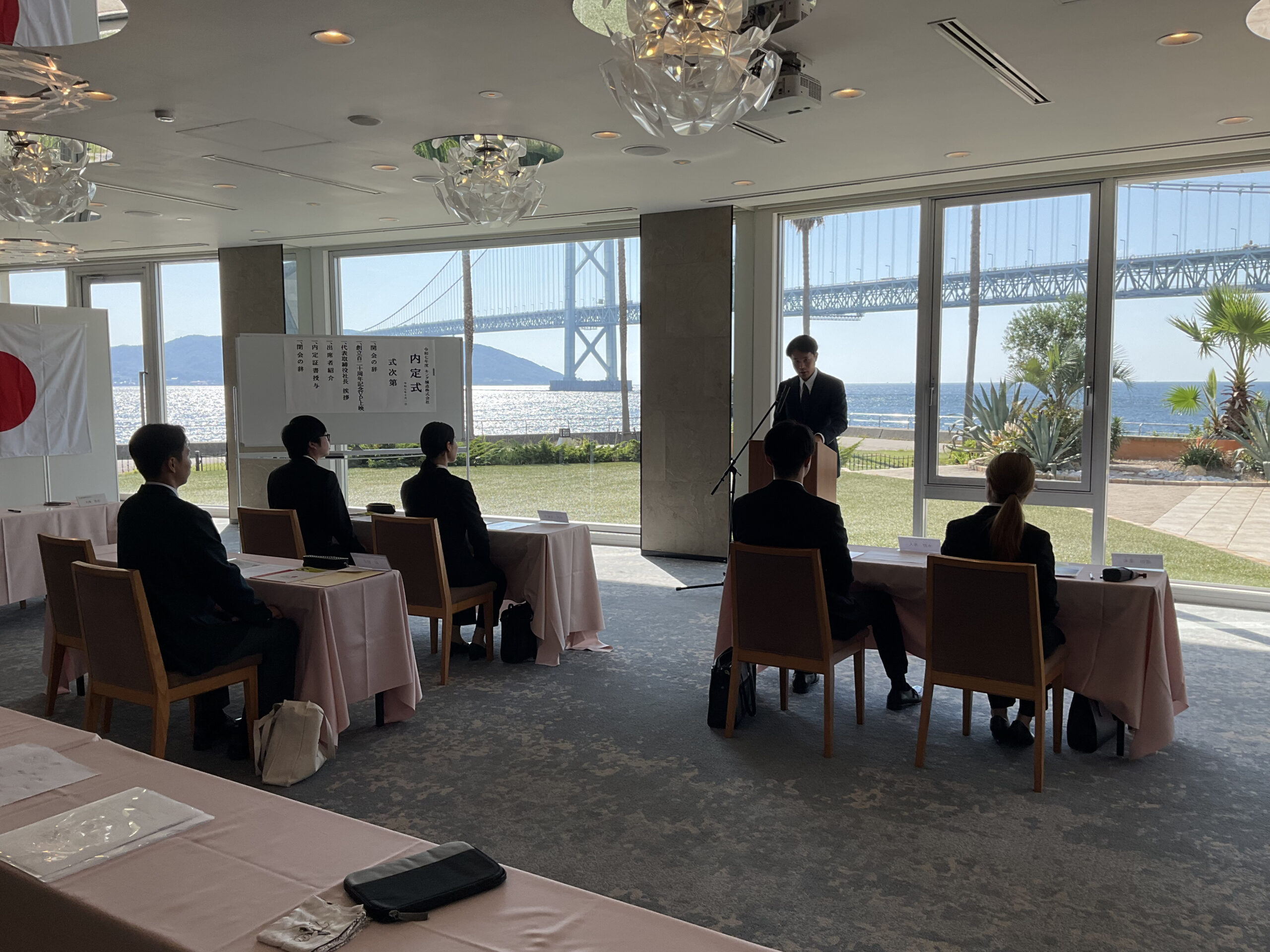 海を背景に、内定者の皆さんの表情も晴れやかで、緊張と期待の入り混じった雰囲気の中で式が始まりました。